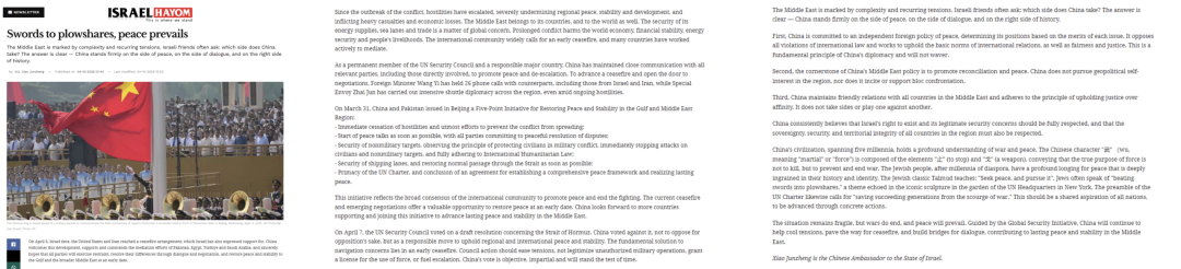 2026年4月10日,中国驻以色列大使肖军正在以色列最大希伯来语报纸《今日以色列》网站发表署名文章《铸剑为犁 守护和平》。全文如下: